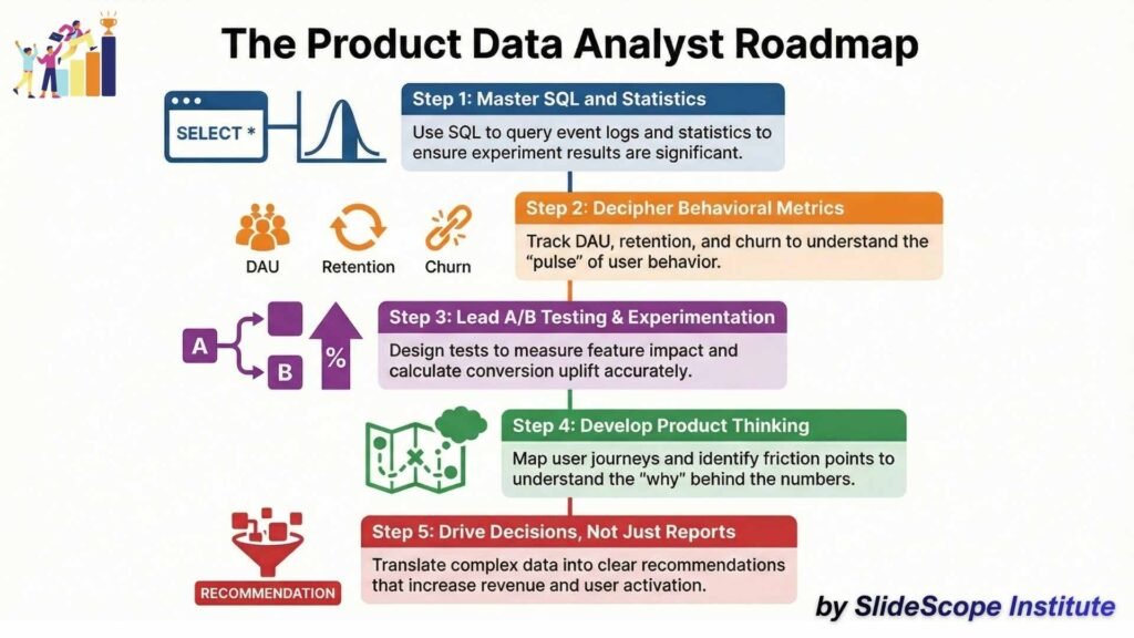 Becoming a Product Data Analyst is not about learning tools alone. It’s about developing the ability to connect user behavior, product performance, business goals, and data storytelling into measurable impact.
