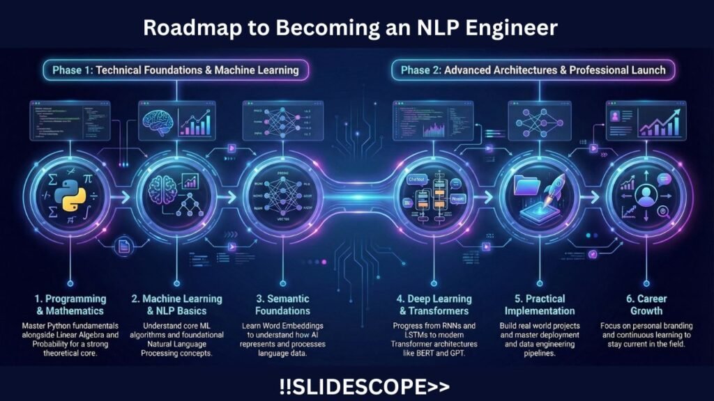 Becoming an NLP Engineer is a structured journey that combines programming, mathematics, machine learning, and real-world application. If you follow this roadmap step by step and focus on practical implementation, you can build a strong career in this field.